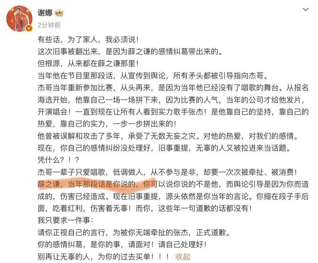 2026年3月3日,谢娜发长文,公开喊话薛之谦,并要求他向张杰道歉。